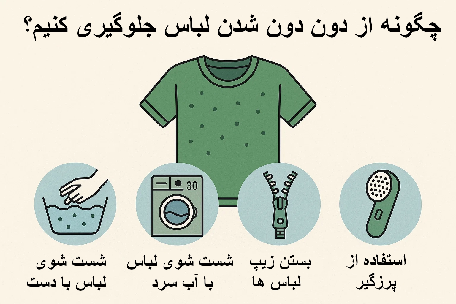 چگونه از دون دون شدن لباس جلوگیری کنیم؟دون دون شدن لباس یکی از مشکلات رایجیه که باعث میشه حتی لباسهای نو هم کهنه و بیکیفیت به نظر برسن.برای جلوگیری از این اتفاق باید بدونیم چرا لباس دون دون میشه و چطور میتونیم جلوی اون رو بگیریم.دون دون شدن لباس به دلیل سایش الیاف پارچه و ایجاد گلولههای ریز (پ…